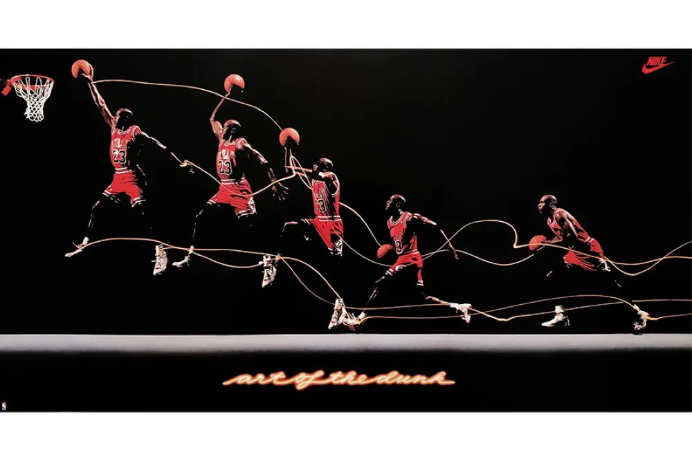 Poster del mate de Michael Jordan surcando los aires de Nike